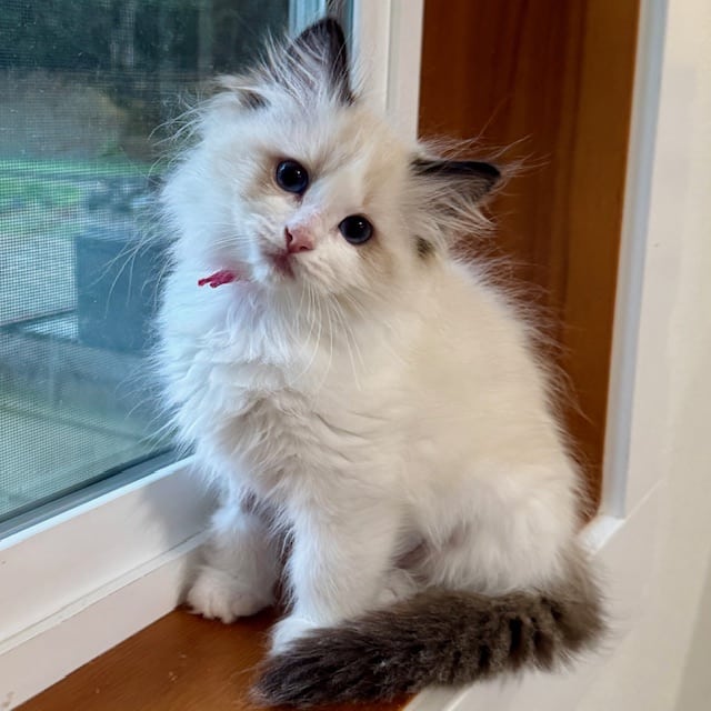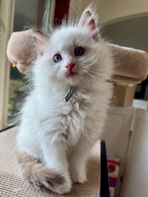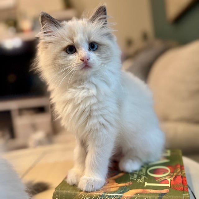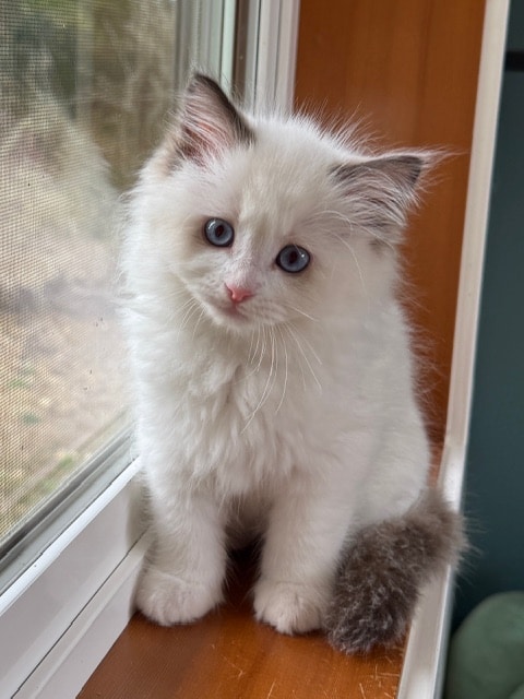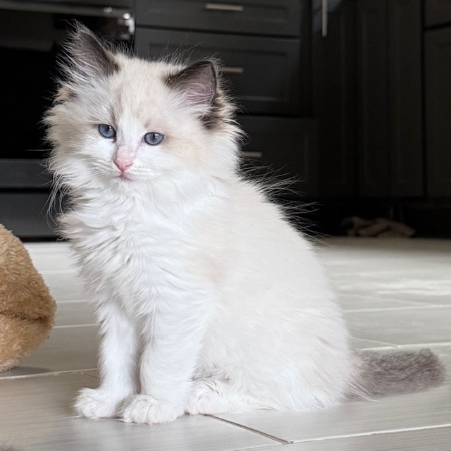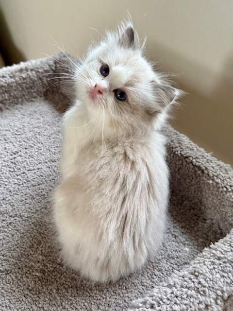 She is betrothed to Prufrock in order to make sizeable seal and blue lynx bicolor ragdolls with moderate coats and beautiful gazes. What Shiv lacks in perfect standard attributes, she more than makes up for in size and coat quality. We expect Prufrock to correct her flaws and add to her excellent temperament. A mixture of pet and show quality kittens are expected from their union in the Spring of 2026.
