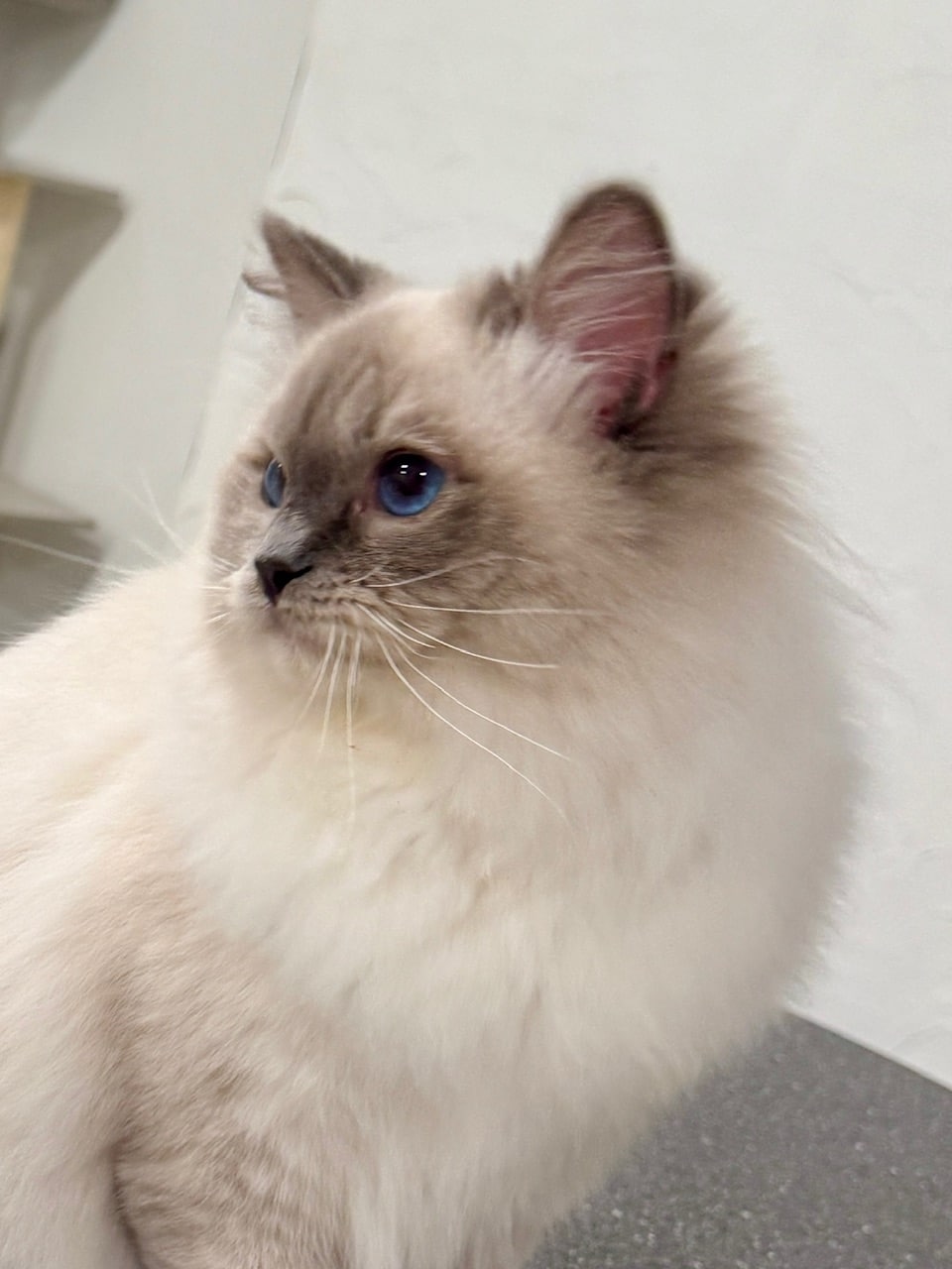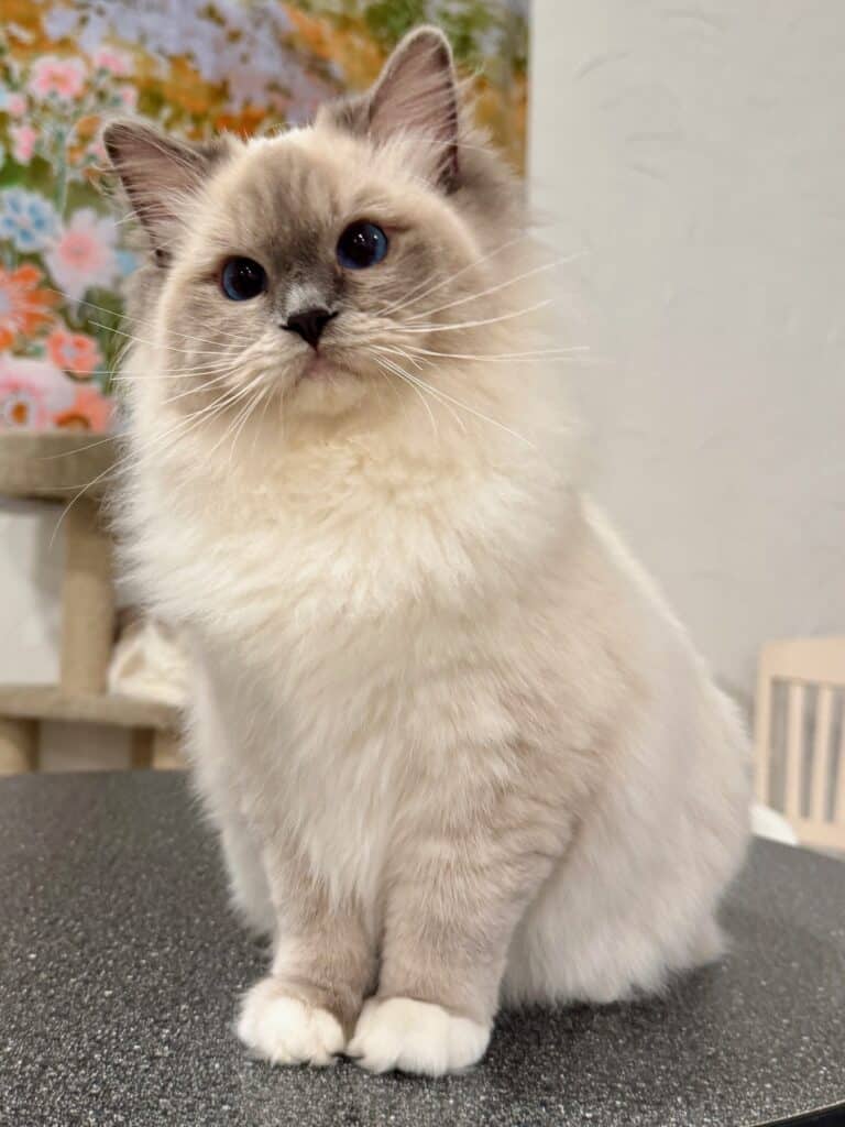 This young lady comes to us from WeLoveOur Ragdolls. I reached out to WeLoveOur Ragdoll Cattery and expressed my desire for a female ragdoll who would cozy up to us at first site. We were looking for a mitted girl, but more importantly, it was the temperament we were after and OMG does Honey deliver on that! These are early photos of her (only 8 months of age), but we couldn’t wait to share her as a “lady in waiting” for 2026.